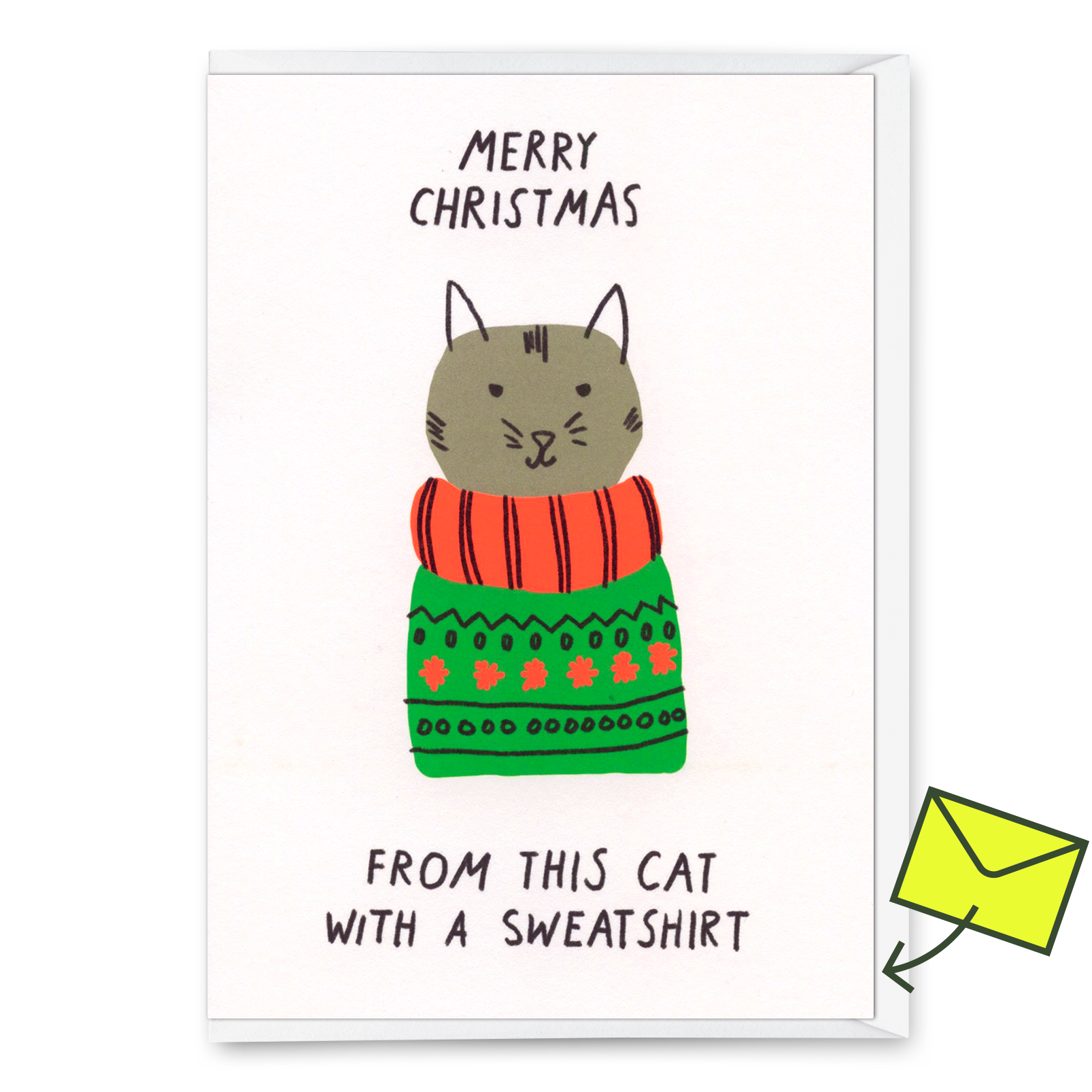 Grußkarte "Cat with Sweatshirt" | Schöne Klappkarte mit Katzen-Motiv zu Weihnachten