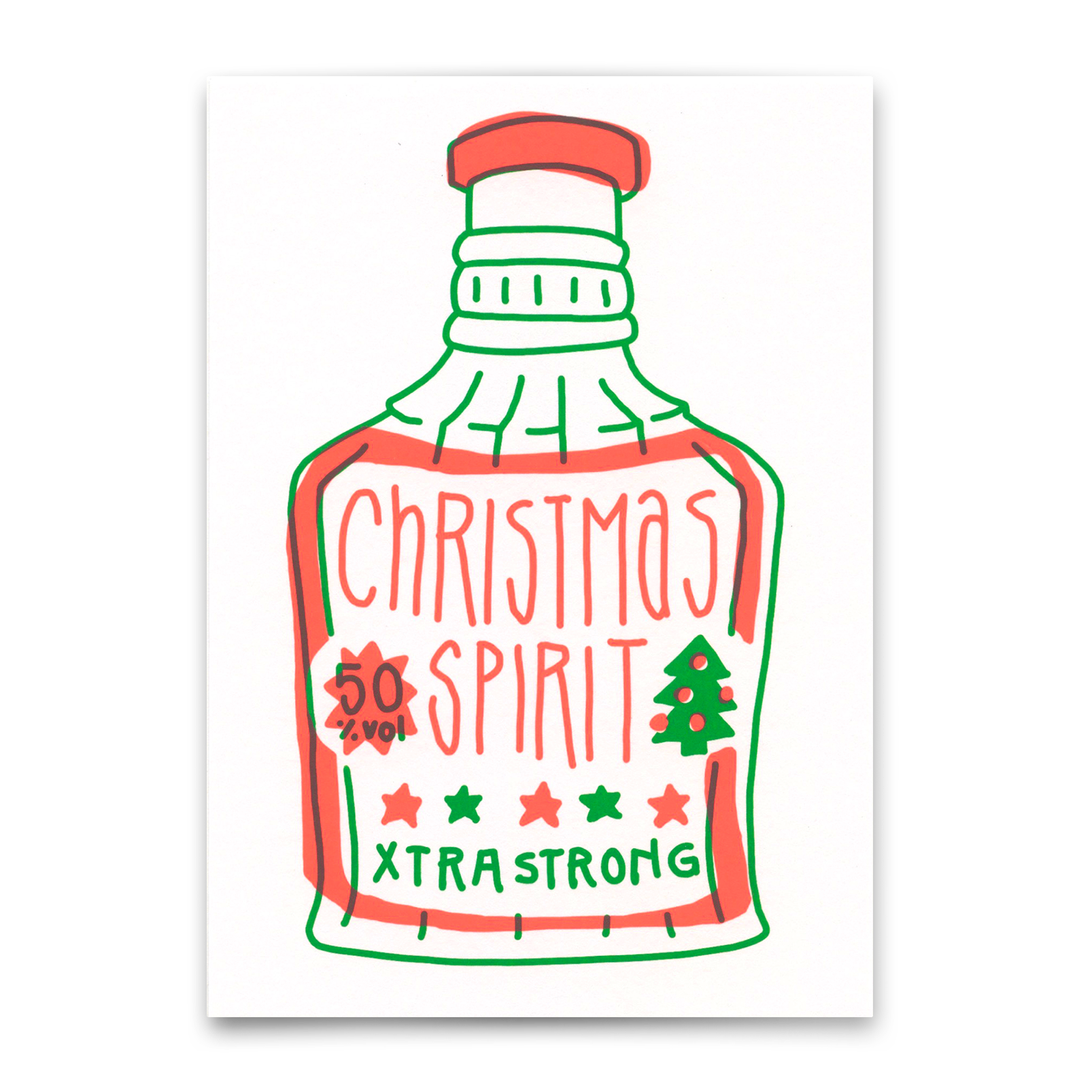 Der Geist der Weihnacht? Der darf bei all dem Trubel auch mal in einer Flasche Hochprozentigem stecken. Diese lustige Karte zu Weihnachten ist nicht nur zum Glückwünschen gut sondern auch noch ein metaphorischer Wink mit dem Zaunpfahl. Zum Wohl.