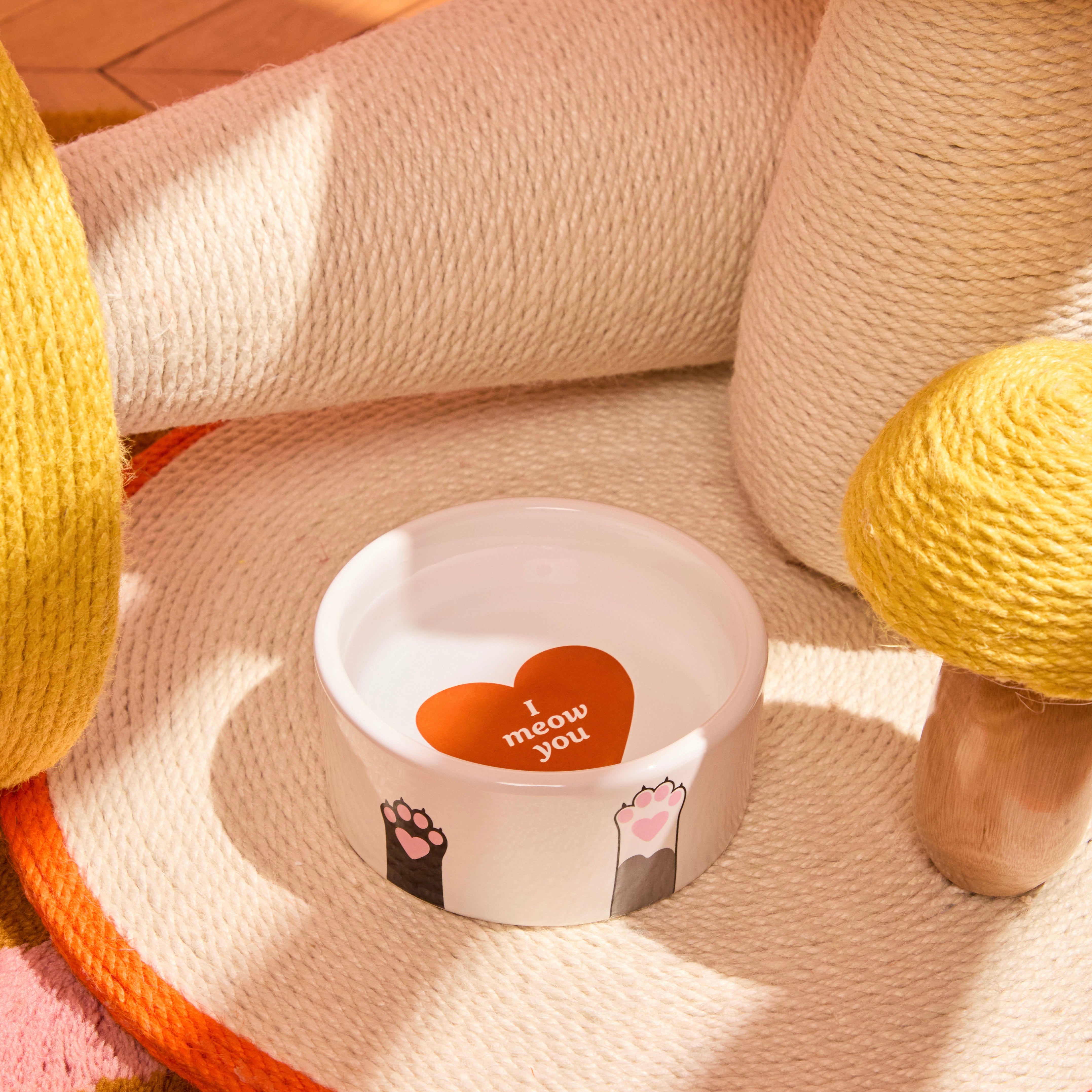 Dieser Futternapf mit Pfotenmotiv bringt spielerischen Charme in den Alltag deiner Katze. Die liebevollen Illustrationen außen und das kleine Herzmotiv im Inneren machen selbst die Fütterungszeit zu einem Designmoment. Gleichzeitig bleibt der Napf klar geformt und fügt sich ruhig in moderne Wohnräume ein.