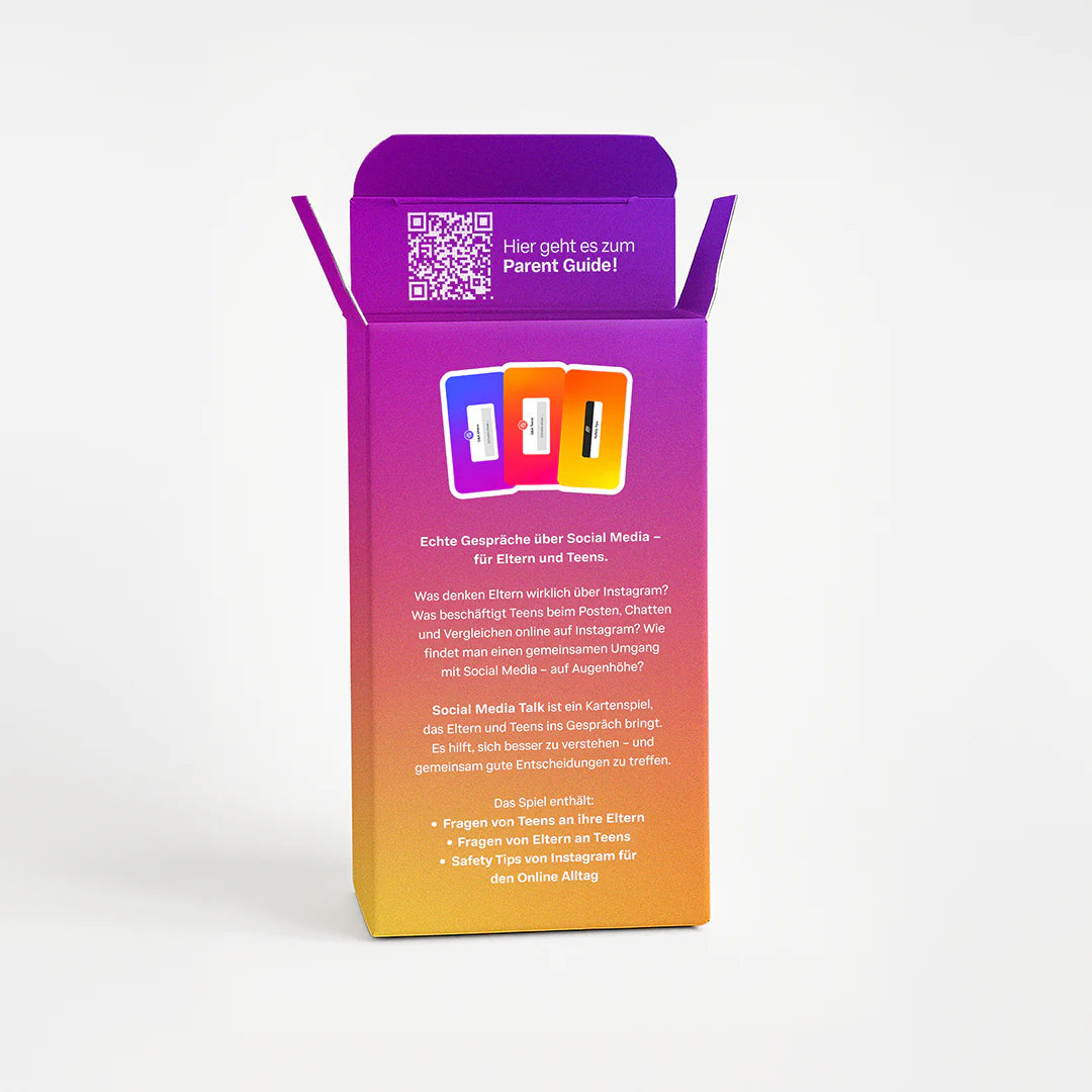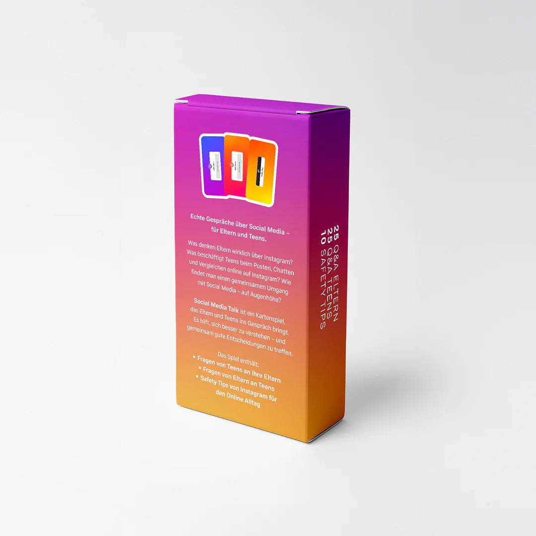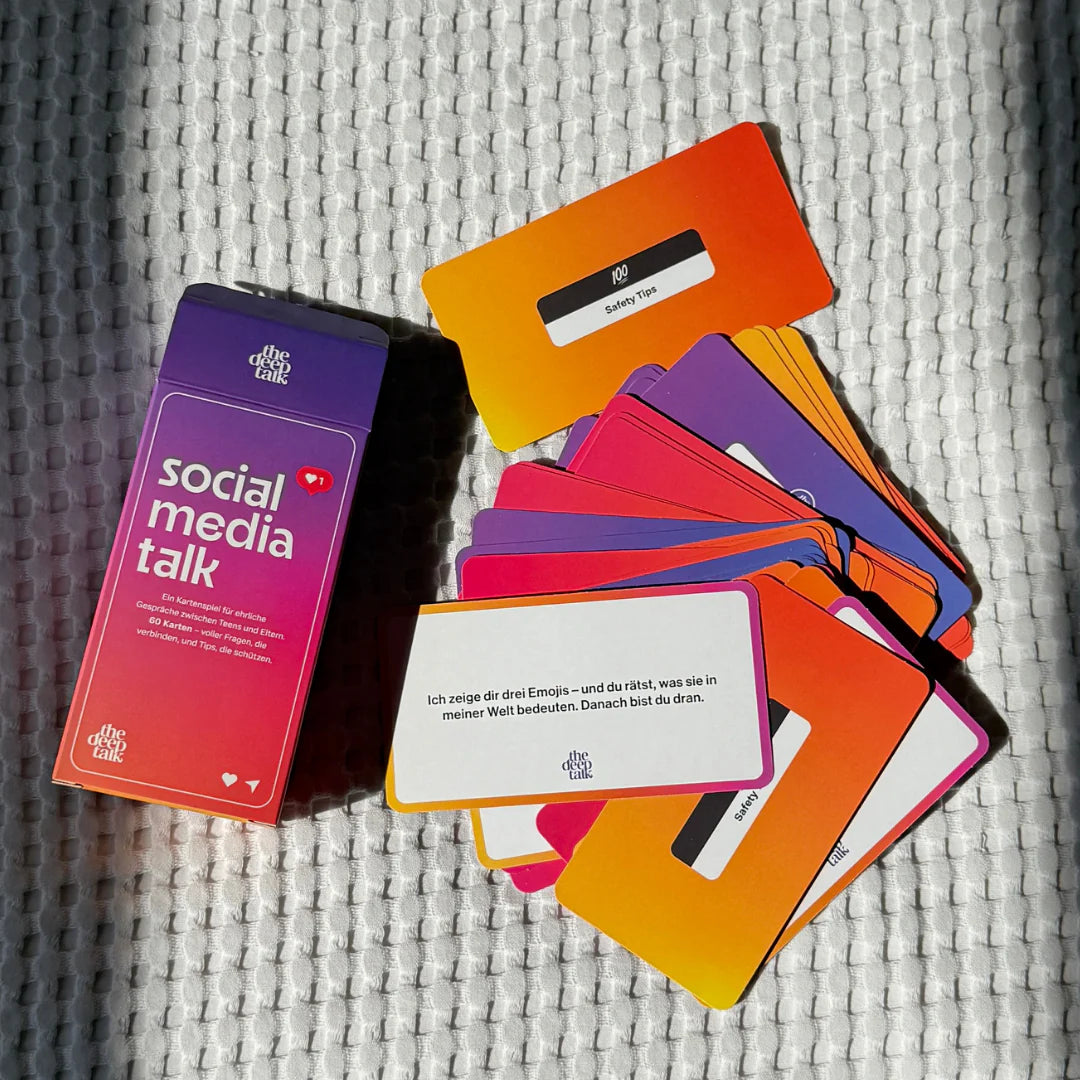 TikTok? Klar. Insta? Natürlich. Aber wann habt ihr eigentlich das letzte Mal wirklich über Social Media gesprochen – ohne Augenrollen oder Erklärungsnot? Das Kartenset “Social Media Talk” bringt Eltern und Teens an einen Tisch. 60 liebevoll entwickelte Karten helfen, Perspektiven zu wechseln, Fragen zu stellen – und einander zuzuhören. Offen, ehrlich und garantiert ohne erhobenen Zeigefinger.