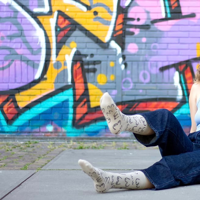 Diese Socken sind alles andere als langweilig: „Titties Socks Beige“ feiern mit Humor, Mut und Stil die Diversität des menschlichen Körpers. Gedruckt in einem sanften Taupe-Beige, sind sie subtil und gleichzeitig provokant – genau das, was man von Eat Mielies erwartet.