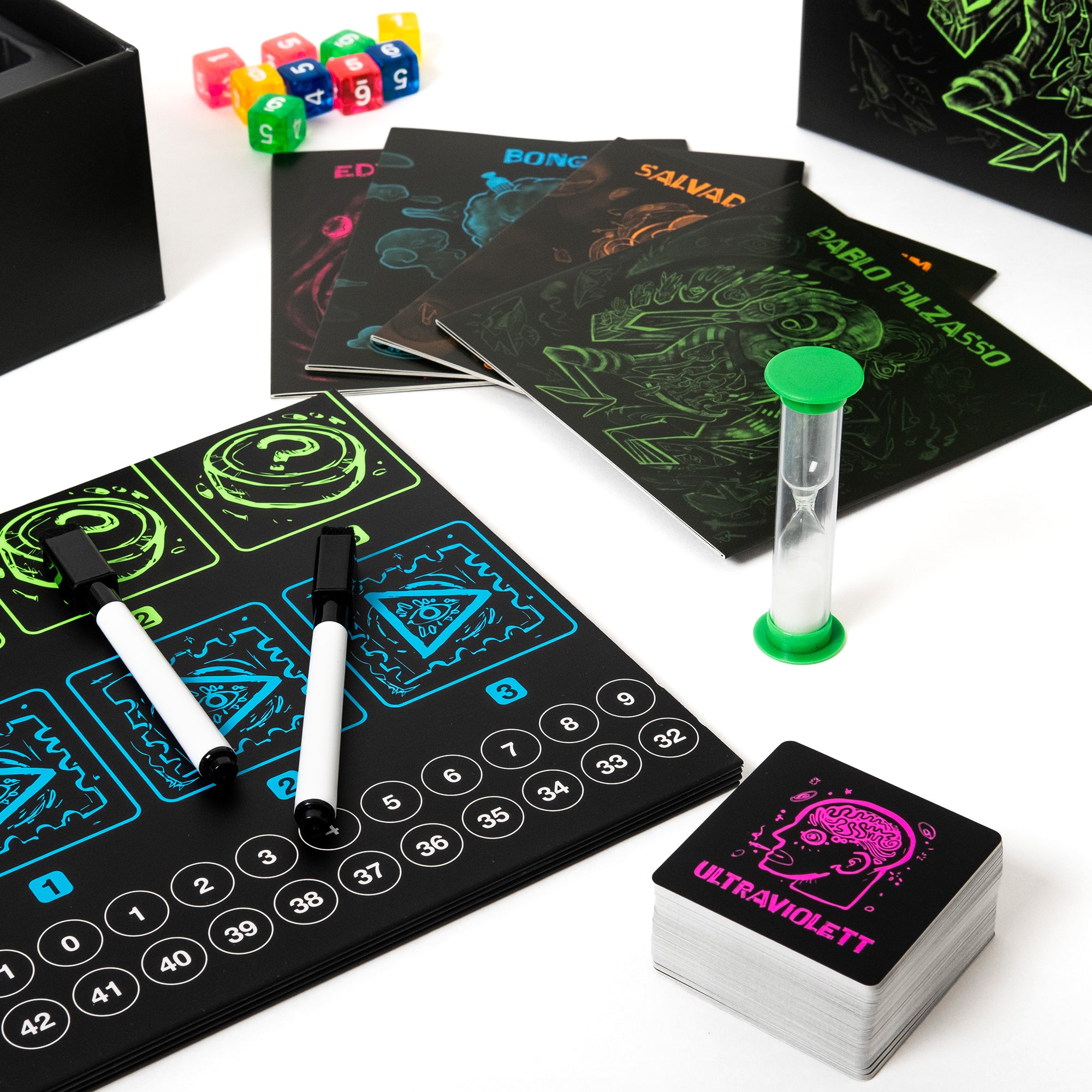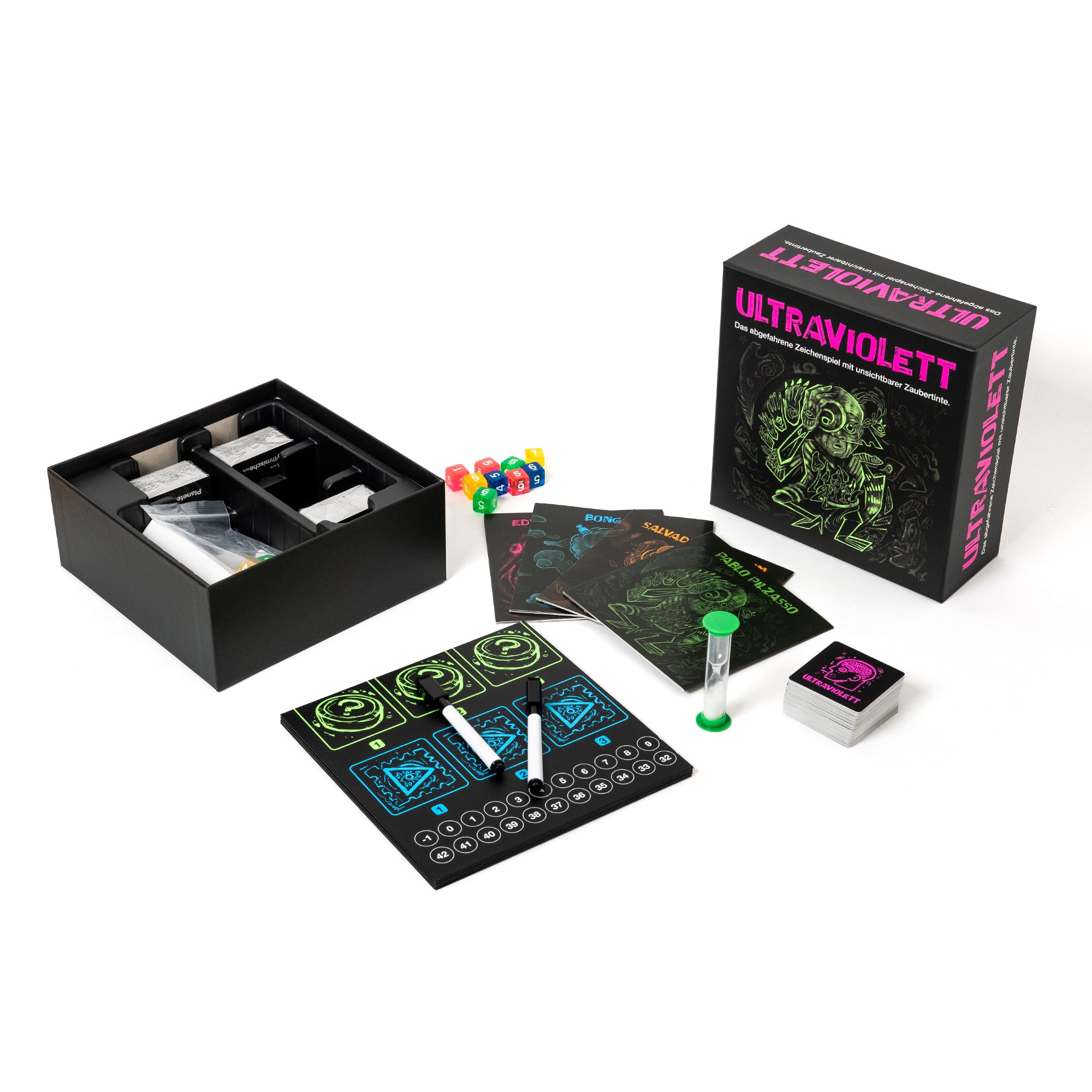„Ultraviolett“ ist ein kreatives Chaos-Zeichenspiel, bei dem ihr mit unsichtbarer Tinte malt – und erst unter UV-Licht seht ihr, was die anderen gekritzelt haben. Chaotisch, lustig und perfekt für alle, die keine Scheu vor schrägen Zeichnungen haben. Ein echter Stimmungsmacher für Gruppen, die Lachen lieben.