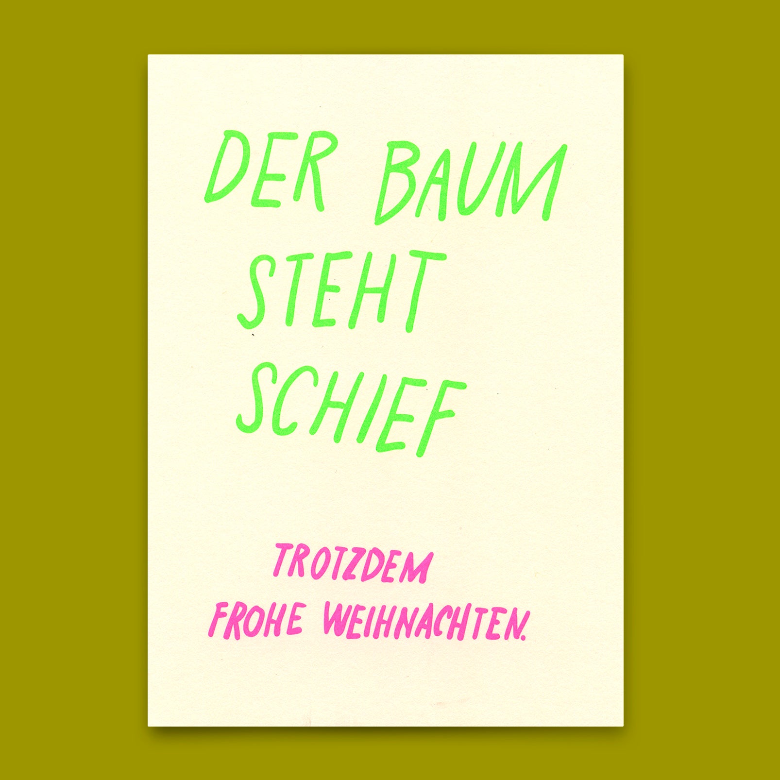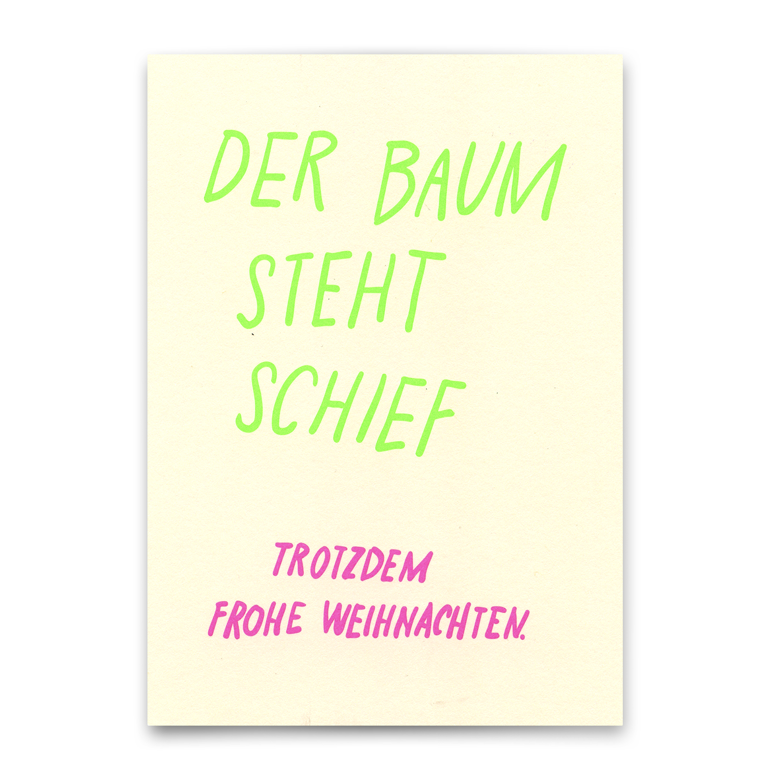 Postkarte "Der Baum steht schief" | Lustige Karte zu Weihnachten mit Spruch