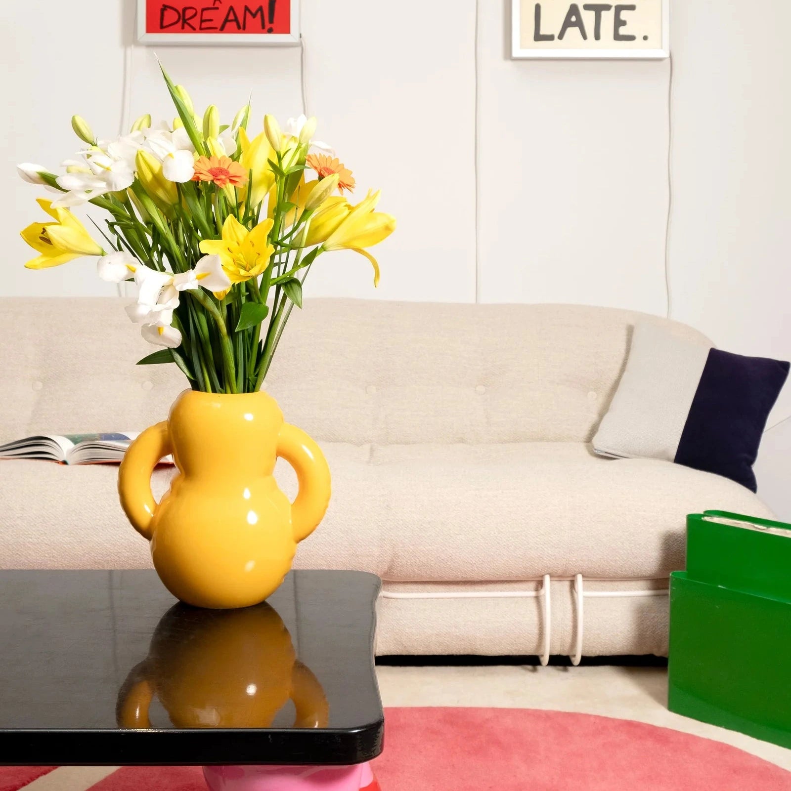 Design that instantly brightens your mood. The "Oscar Gloss" vase in Yolk brings energy and character to any room with its warm yellow hue. As part of Home Studyo's Blow Up Collection, it combines humorous design with modern ceramic art.