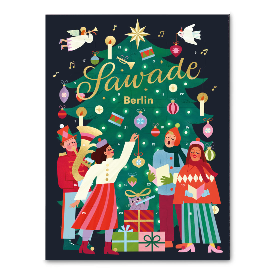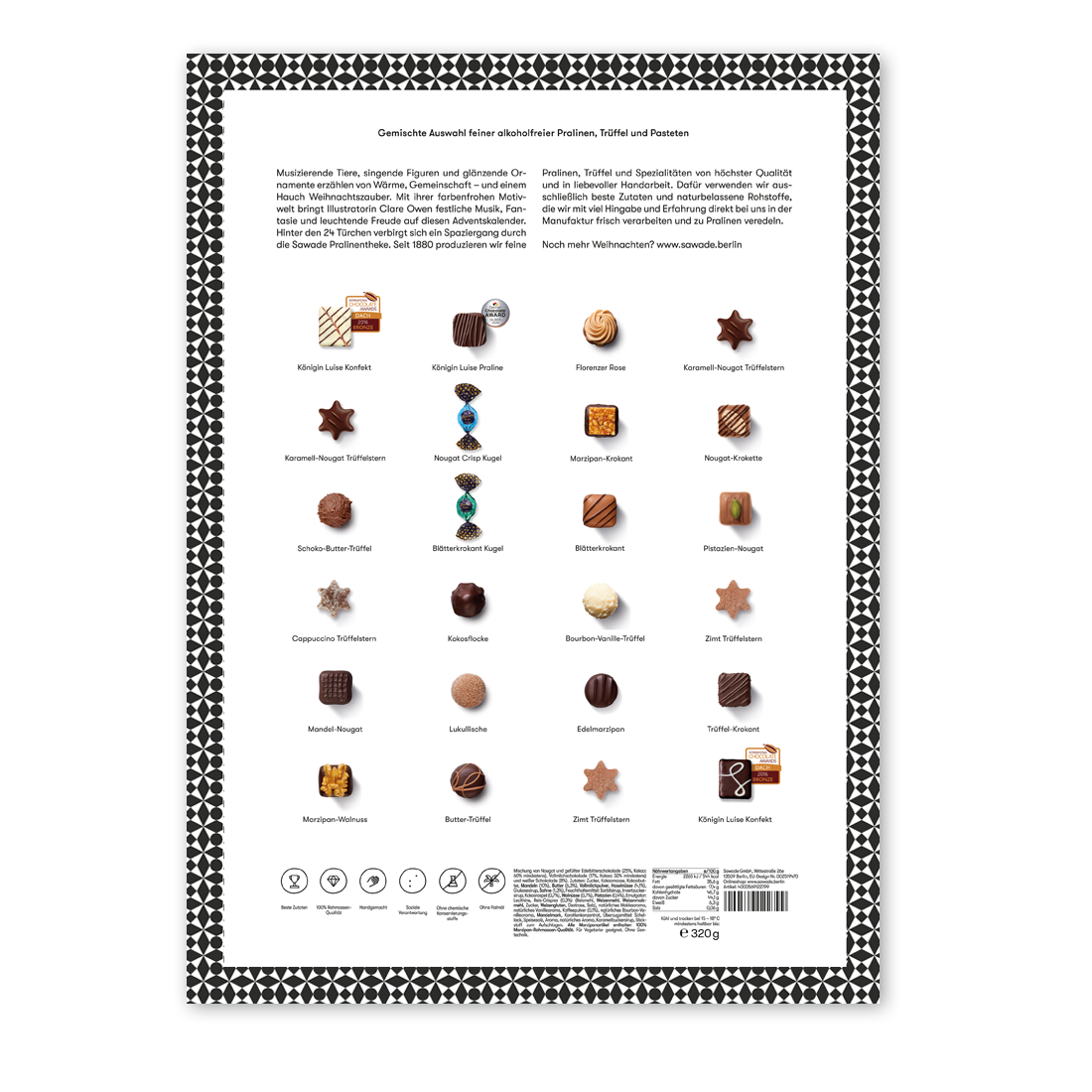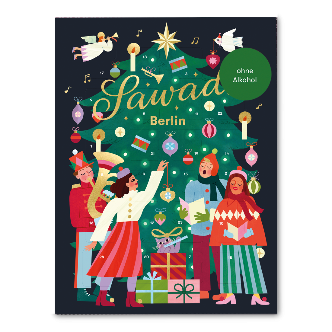 Dieser Adventskalender verbindet Genuss mit festlicher Vorfreude – ganz ohne Promille. Hinter 24 Türchen verbergen sich alkoholfreie Pralinen, Trüffel und Pastetenkonfekt, liebevoll gefertigt in der Traditionsmanufaktur Sawade. Das illustrierte Tannenbaumdesign von Clare Owen macht ihn zum Kunststück und festlichen Blickfang zugleich.