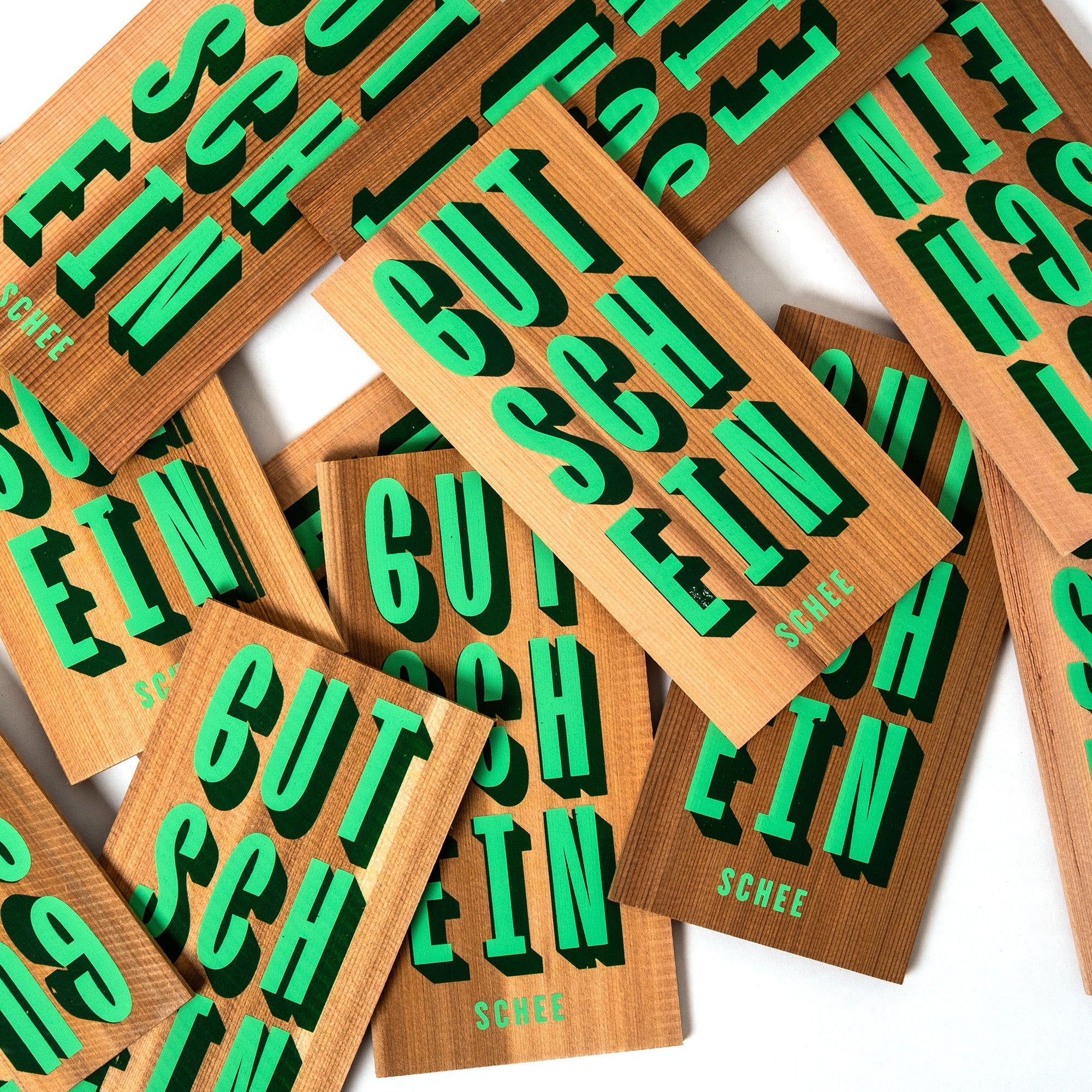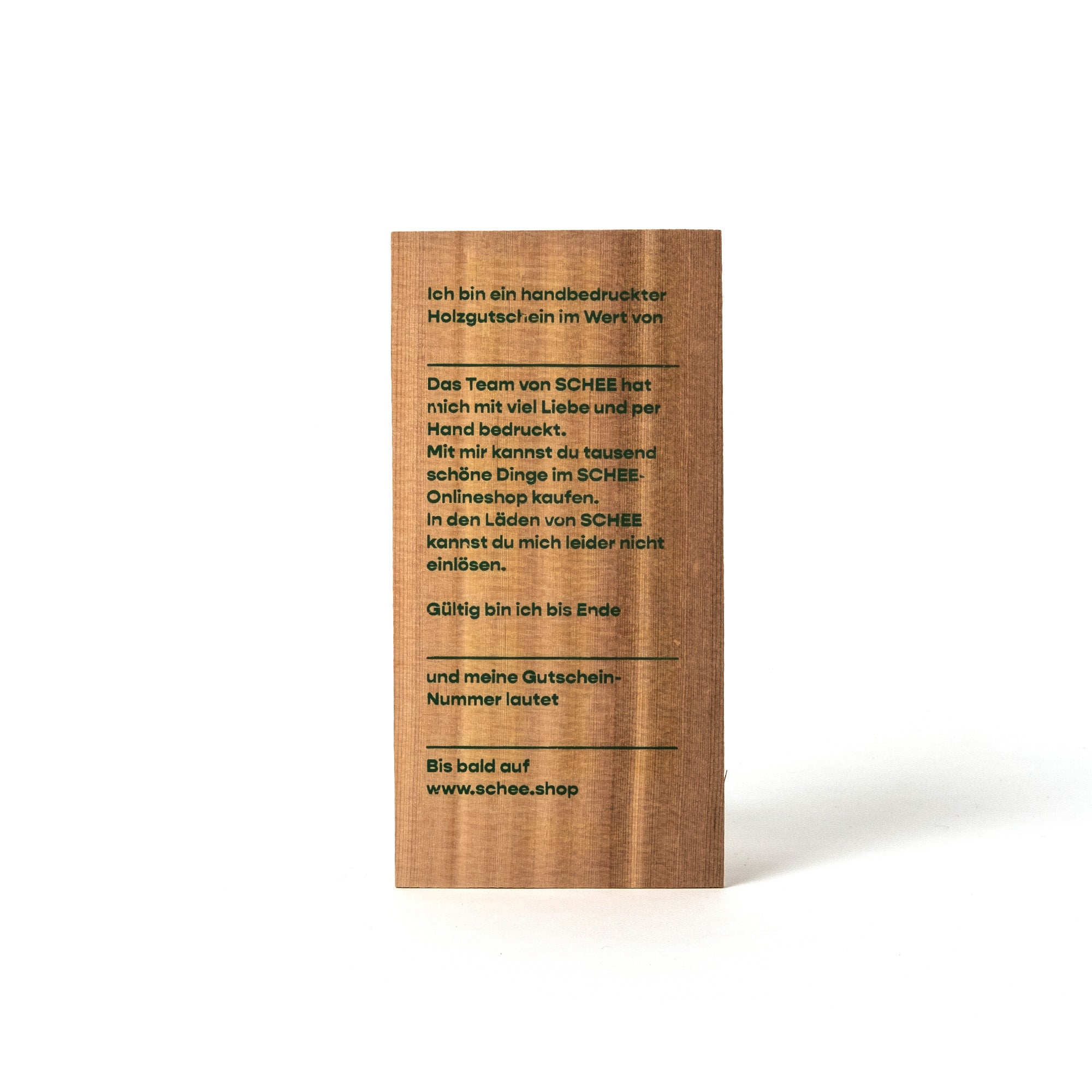 Du willst etwas zum Überreichen? Der Holzgutschein ist ein Add-on zum digitalen SCHEE Gutschein. Den Code bekommst du digital, das Holz kommt per Post – eintragen, verschenken, fertig.