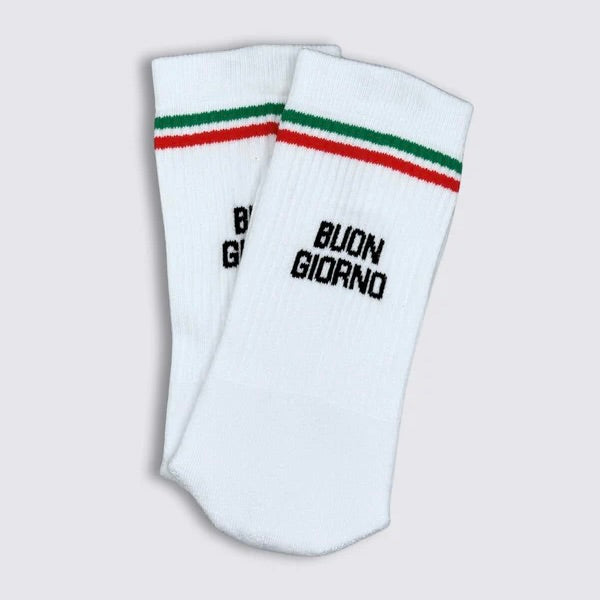 BUON GIORNO – und der Tag kann kommen. Schwarze Message auf weißer Socke mit Retro-Streifen in Italien-Farben bringt gute Laune direkt an den Fuß. Weich, bequem, langlebig – und mit genau der richtigen Portion Dolce Vita. Morgenmuffel? Nicht mit diesen Socken.