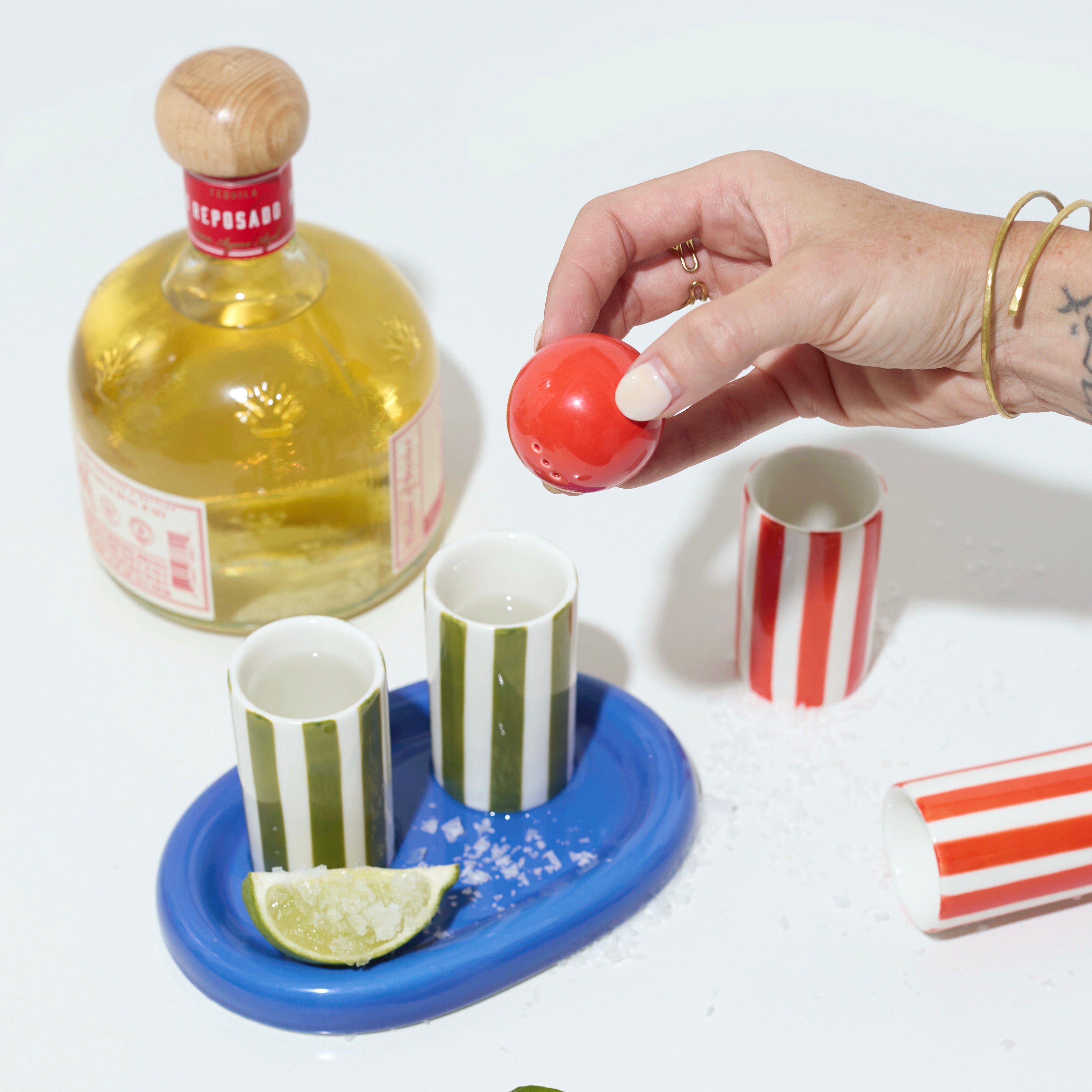 Salz, Shot, Style: „The Lily Mae“ bringt Farbe und Haltung an die Bar. Das Set kombiniert grafisch gestreifte Shotgläser in Cobalt & Olive mit einem passenden Tray und einem integrierten Salzstreuer. Alles aus Keramik, alles aufeinander abgestimmt – perfekt für Tequila-Momente mit Designanspruch.